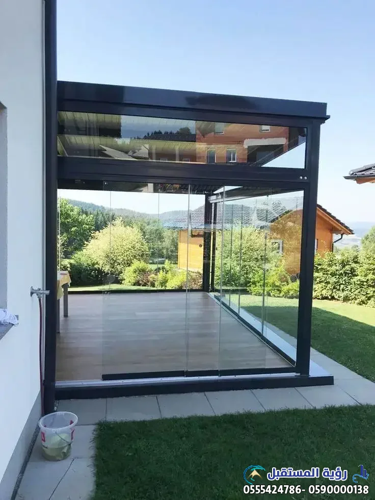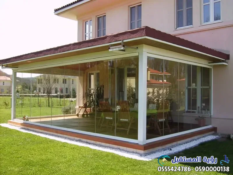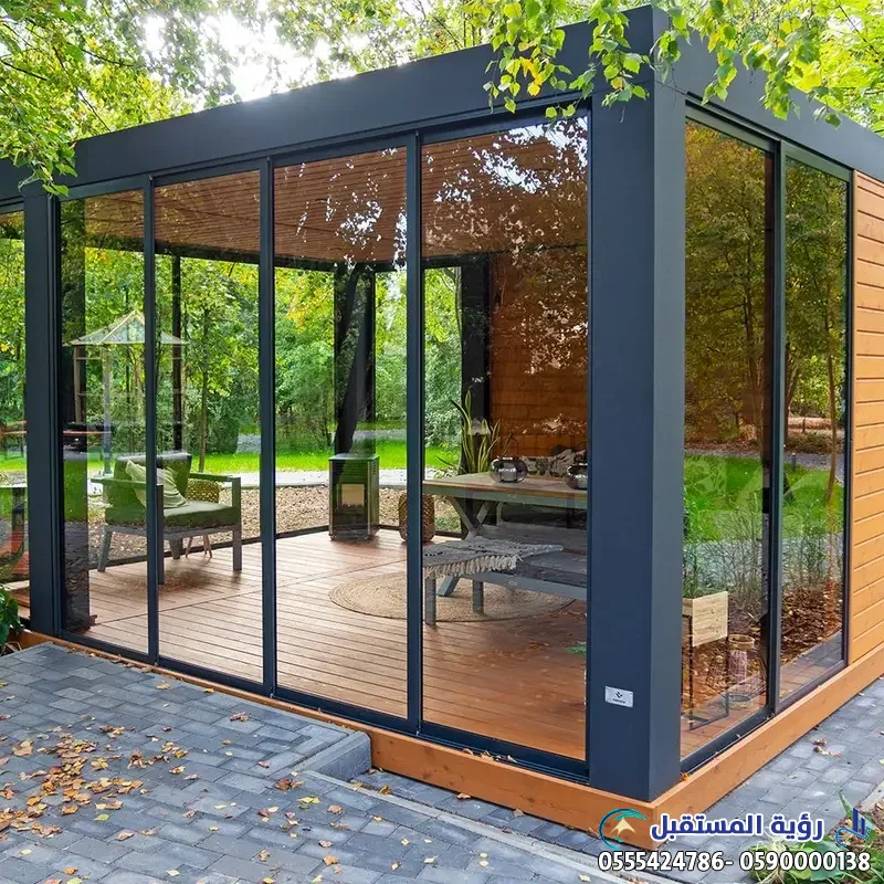 المظلات والبرجولات: استخدام مظلات من الألمنيوم، الخشب المعالج، أو قماش الـ PVC المقاوم للأشعة فوق البنفسجية يوفر حماية فعالة. يمكن دمجها مع تصميمات تسمح بمرور الهواء لتعزيز التبريد الطبيعي.