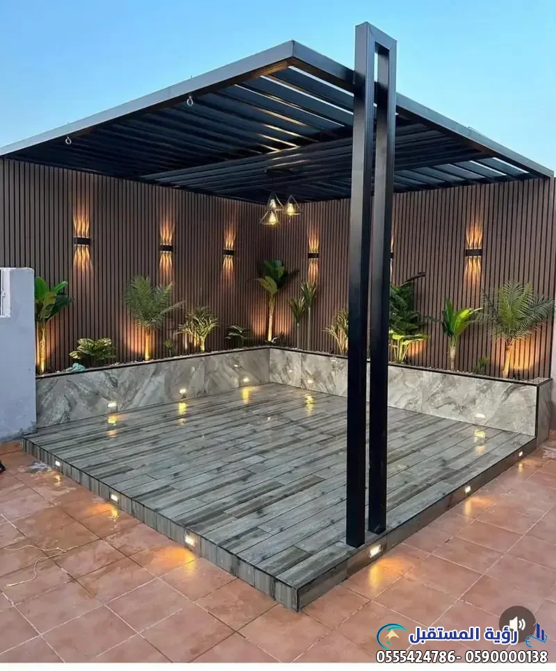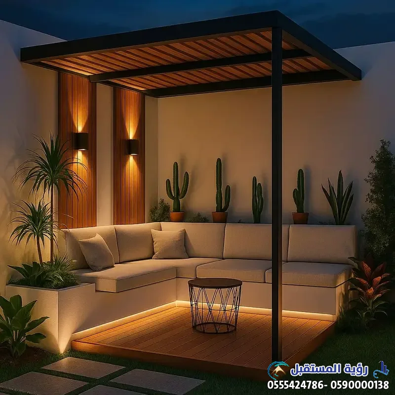 الإضاءة كعنصر ديكوري: الاعتماد على إضاءة متعددة المستويات: إضاءة وظيفية قوية، وإضاءة محيطية (على جوانب السترة أو أسفل النباتات) لخلق جو ساحر ليلاً، بالإضافة إلى استخدام فوانيس وأضواء أرضية.