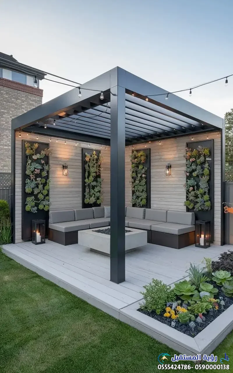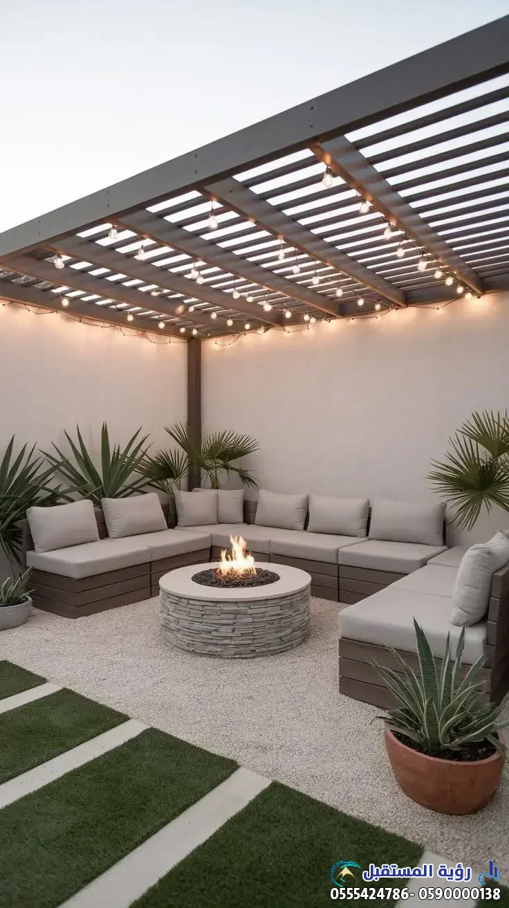 جلسات "الراحة والاسترخاء": يتم فيها استخدام أثاث مريح ومقاوم للعوامل الجوية، مع التركيز على الإضاءة الخافتة والنوافير المائية أو الشلالات الجدارية الصغيرة لخلق جو من الهدوء والسكينة.